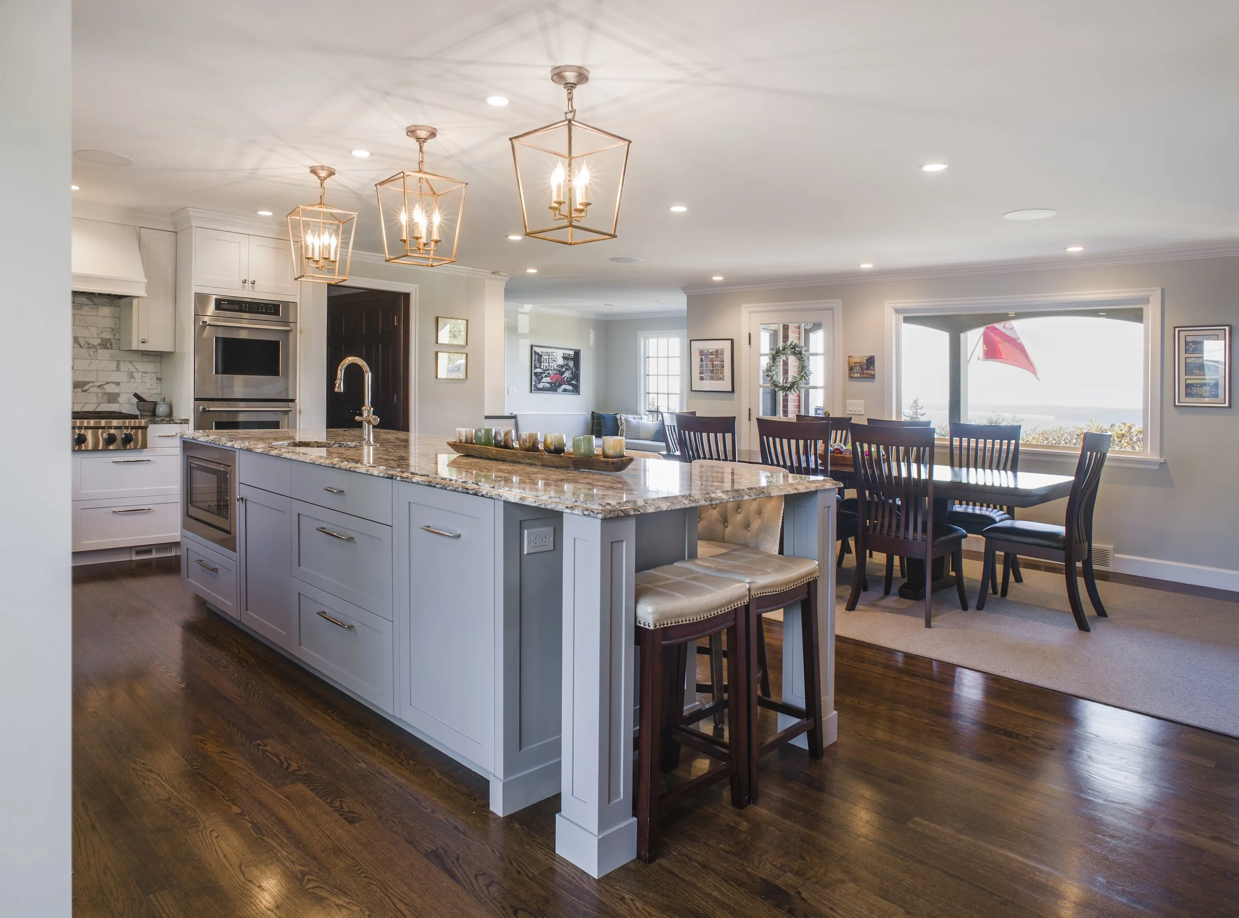 The remodel focused on creating a more cohesive and functional main living space while maintaining clear zones for daily use. Walls were removed to open the kitchen, dining, and living areas, allowing light and views to move freely throughout the home. From every primary space, sightlines now extend toward the water, ensuring the Puget Sound remains a constant presence in daily life.